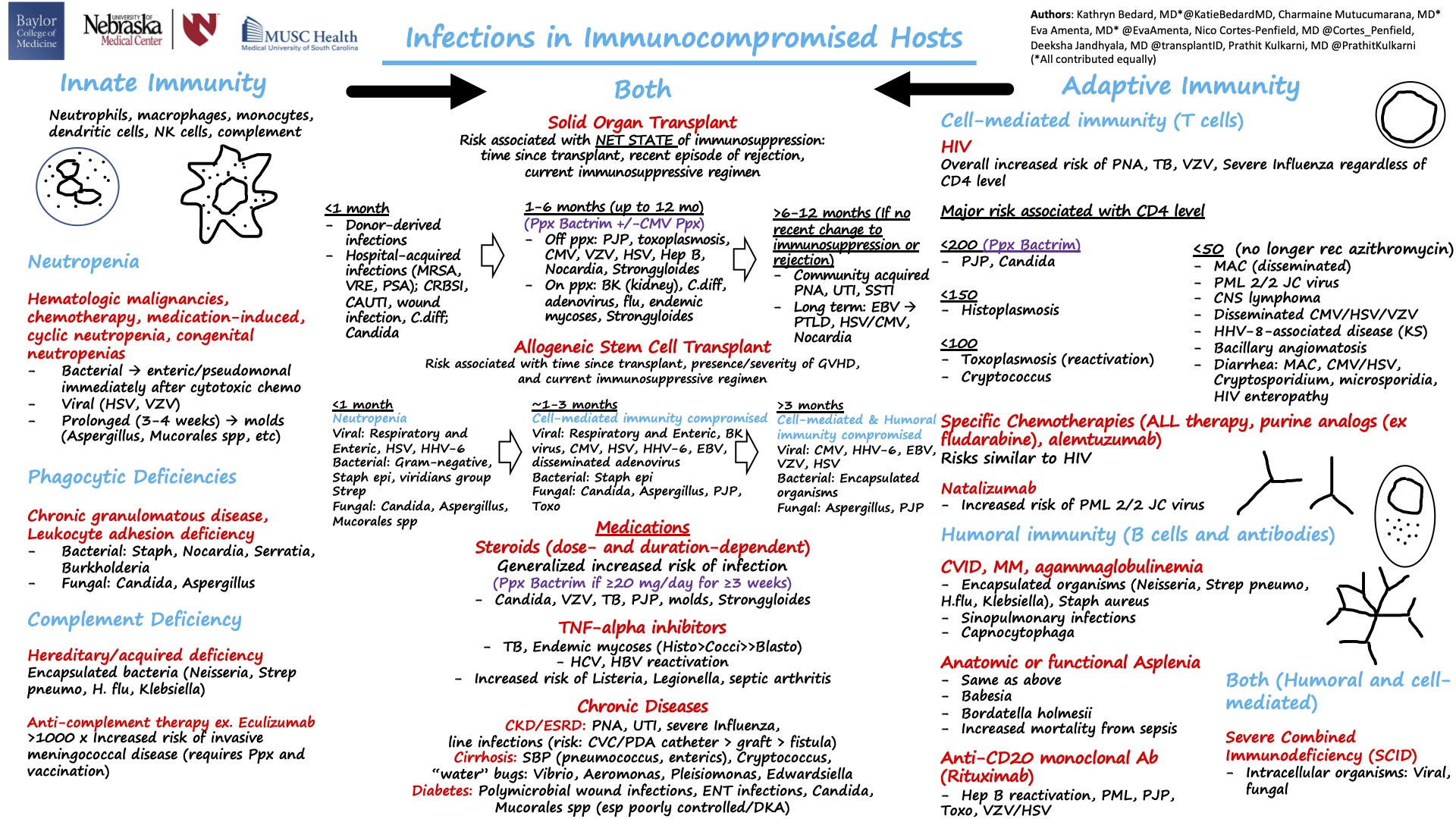 | Organ-transplant recipients | Viruses, donor-derived infections, Strongyloides hyperinfection, opportunistic fungi, rejection, GVHD, HLH, ureaplasma hyperammonemia |