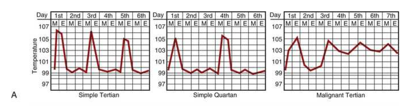 Febrile paroxysms may occur every other day for P. vivax, P. ovale, and P. falciparum (tertian fever) and every third day for P. malariae (quartan fever).