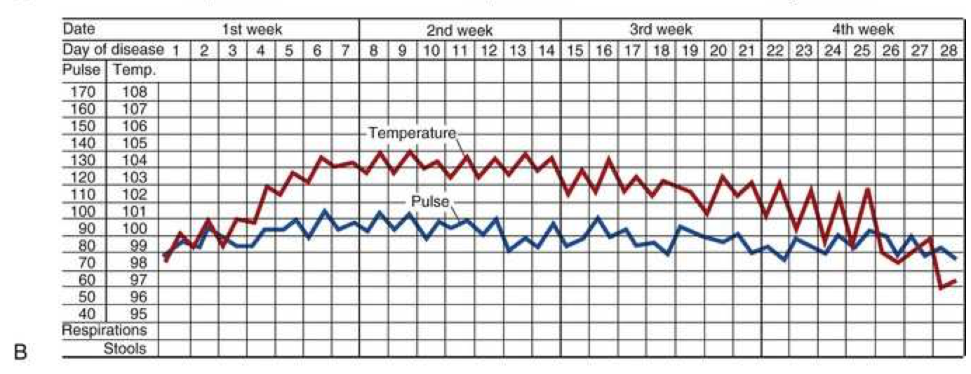 | Enteric fever (Salmonella Typhi) | Recent travel to endemic country; consumption of potentially contaminated food or water | Headache, arthritis, abdominal pain, relative bradycardia, hepatosplenomegaly, leukopenia |