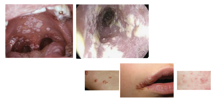 Candida- Thrush, esophagitis (odynophagia, retrosternal pain)