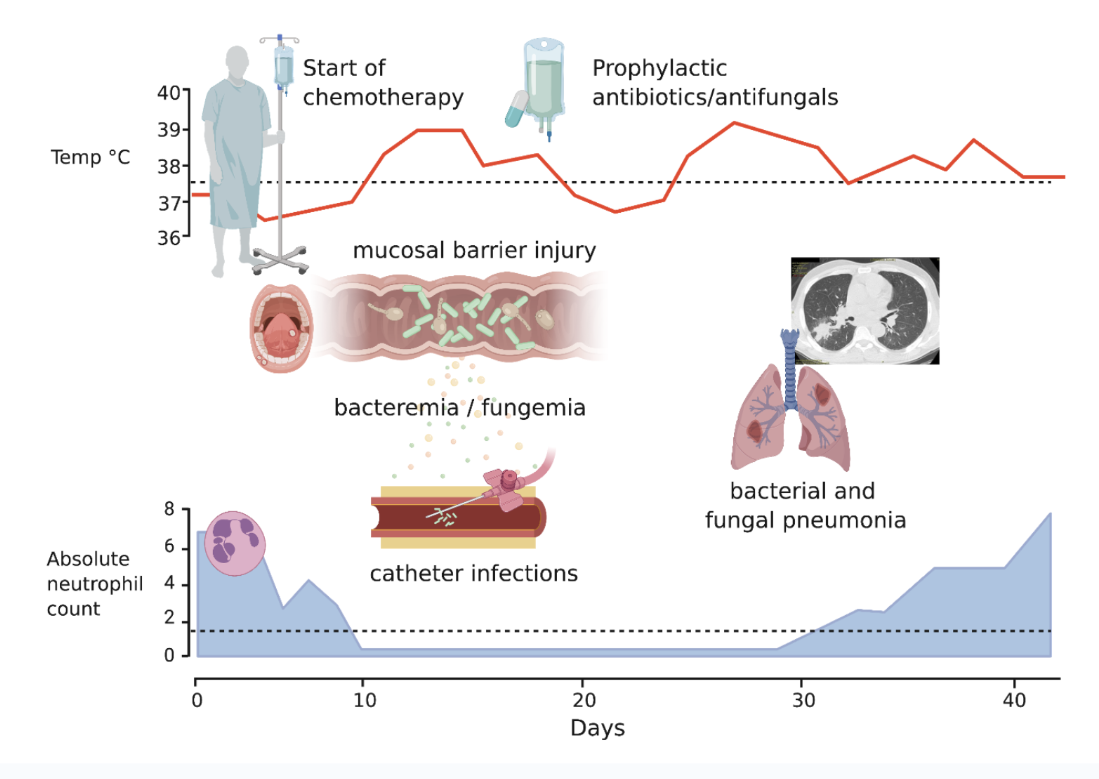 Persistent fever ≥4 days on empiric antibiotics: Consider adding antifungal therapy with anti-mold activity; duration guided by clinical course, neutrophil recovery