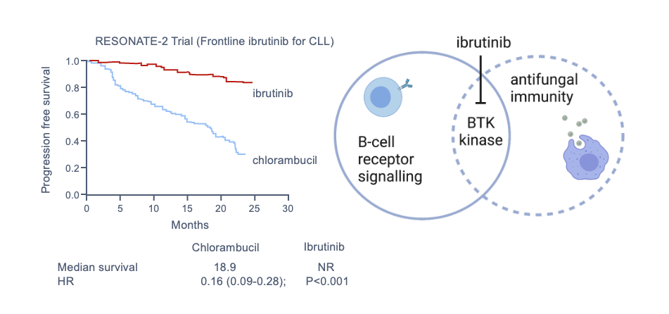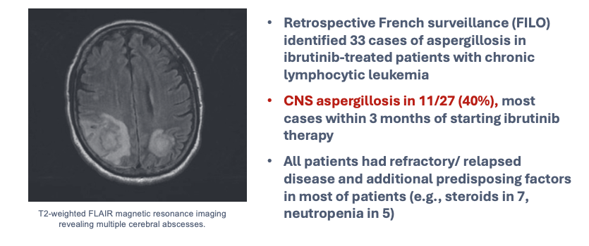 | Ibrutinib | BTK inhibitor | Aspergillosis, PJP |