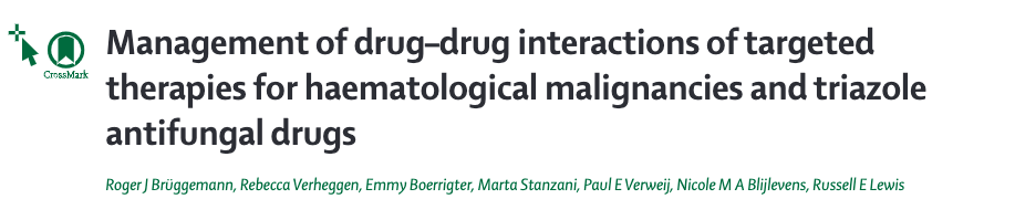 Brüggemann RJ, Verheggen R, Boerrigter E, Stanzani M, Verweij PE, Blijlevens NMA, et al. Management of drugdrug interactions of targeted therapies for haematological malignancies and triazole antifungal drugs. The Lancet Haematology 2022;9:e58–72.