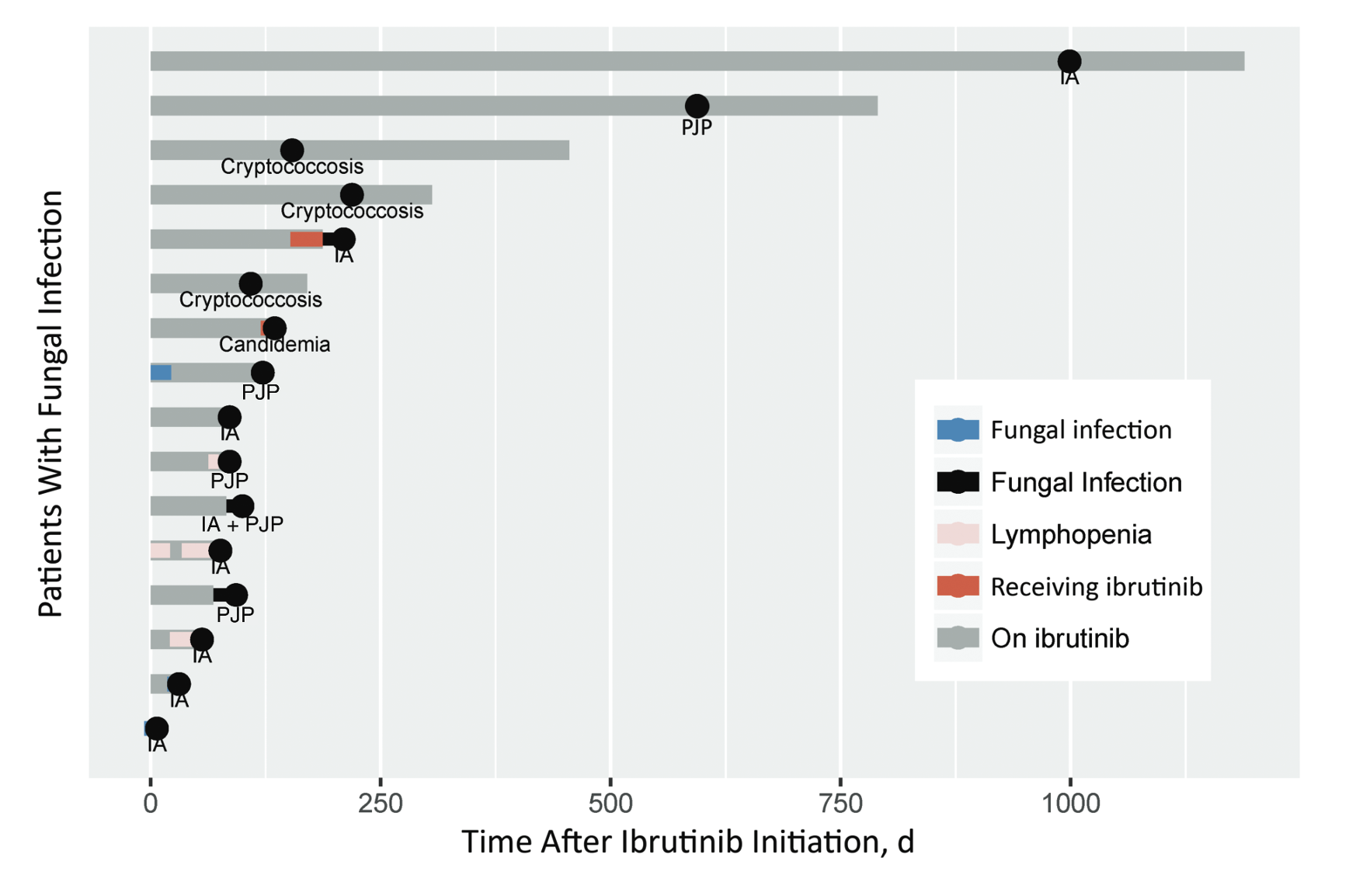 Frei M, Aitken SL, Jain N, Thompson P, Wierda W, Kontoyiannis DP, et al. Incidence and characterization of fungal infections in chronic lymphocytic leukemia patients receiving ibrutinib. Leukemia & Lymphoma 2020;61:2488–91.
